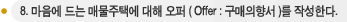 방문했던 집들 중에서 마음에 드는 집이 있으면 오퍼를 작성하여 전속중개인으로 하여금 리스팅브로커에게 전달한다. 적어도 이 단계 이전에 구입자의 자금조달에 문제가 업는지를 다시 확인하고 모기지대출에 대한 대출기관의 확약서(Pre-approval Letter 등)를 받아두는 것이 좋다. 오퍼가 집을 내 놓은 주인에 의해 수정 없이 받아들여지면 그 오퍼는 곧바로 완전한 계약서가 된다. 집주인이 오퍼를 받으면 가장 먼저 눈이 가는 곳이 바로 이 숫자이므로 마음에 드는 집일수록 첫 제시가격을 신중하게 결정해야 한다.