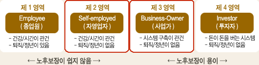 제1영역의 ‘종업원’(Employee : 근로소득자 )은 다른 사람에 고용되어 급여를 받고 생활하는 사람들이다. 건강한 육체와 지식, 그리고 본인의 경험을 투입하여 성과를 보여주고 그 대가로 급여를 받는다. 일반적으로, 투입된 시간에 따라 급여가 책정되므로 건강을 잃으면 장기적으로 계속 이런 방식으로 생활하기는 어려우며, 일정한 퇴직연령이 정해져 있어서 노후에 계속할 수 있는 방식은 되지 못한다. 그러므로, 노후 생활을 이런 방식으로 살 수 있으리라 기대하기는 어렵다.