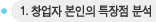 성격, 기질, 경력, 전공분야, 취미, 자금사정, 가족의 지원가능 여부, 인맥, 언어능력, 의사소통(커뮤니케이션)능력과 리더쉽의 정도, 건강 등을 모두 고려하여 본인의 강점과 약점을 도출하여 적어본다.