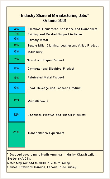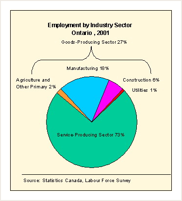 5년마다 실시되는 전국 통계 중 가장 최근의 통계인 2001년도에 캐나다통계청이 조사한 온타리오주의 고용통계에 따르면, 총 근로인구는 596만명이며, 이 중 남자가 53% 여자가 47%를 가각 차지하였다. 총 근로자 중에서 상시근로자(full-time) 는 82%, 파트타이머(part-time)는 18% 이다. 고용형태별로는 피고용인이 85%, 자영업자(Self-employed)가 15%를 차지하였다.