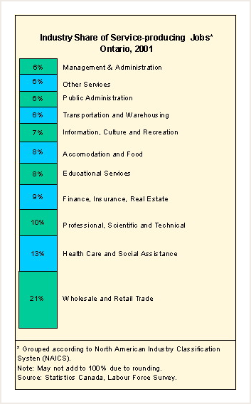 이 중 서비스산업을 부문별로 나누어보면, ( 표2 )에서 보는 바와 같이 도소매 21%, 의;료,보건 13%, 엔지니어링,기술분야 10%, 금융,증권,부동산분야 9%, 교육서비스분야 8%, 숙박, 음식업 8%, 정보,분화,오락분야 7%, 운수,창고업 6%, 공공기관 6% 를 각각 차지하였다. 전체적으로 보아서 아직도 캐나다의 고용시장은 각 산업영역별로 비교적 견실한 모습을 보이고 있다.