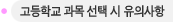 고등학교의 과목선택 시 유의할 점은, 각 대학이 전공부문별로 요구하는 11학년이나 12학년의 필수 이수과목들이 있는데, 이러한 과목들을 막상 11학년이나 12학년과 같은 고학년이 되어 들으려 해도 각 과목별로 선수과목(Pre-requisite ; 어떤 과목을 수강하기 위해서 그 이전에 반드시 수강해야 할 기초과목 )이 있으므로 이 선수과목들을 10학년 때에 미리 이수해 두어야 하는 경우가 많다.