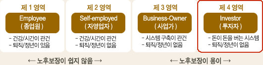 제4영역의 ‘투자자’(Investor)는 자본금(돈)을 가지고 다른 수익을 창출하는 경우이다. 즉, 돈이 있어야 돈을 벌 수 있는 영역이다. 물론 타인자본(부채)을 빌려 투자하기도 하지만, 일반적으로 일정한 종자돈 (Seed Money)가 있어야 이 시스템에 참여할 수 있다. 당연히 노후가 보장되며, 자기의 노동투입시간이나 건강, 연령과는 관계없이 자본 자체가 제 스스로 수익을 만들어 낸다.