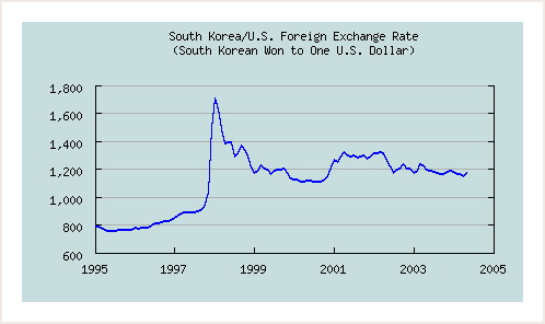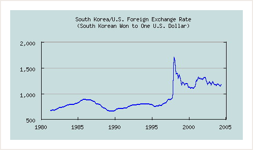 아래의 표는 한국이 1997년말 IMF 외환위기를 겪는 과정을 지나오면서 원화가 미국의 달러화에 대해 어떤 변화를 가져 왔는지를 보여준다.